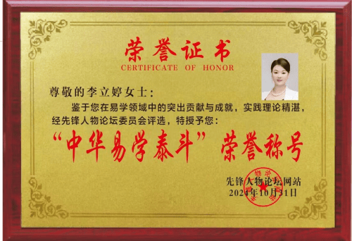 2024年11月荣获中国易学杰出贡献人物。 在易学的广袤天地中,李立婷尤其在姓名学和风水领域展现出了卓越的才华和深厚的造诣。 姓名学,在她的眼中,不仅仅是简单的文字组合,而是蕴含着深刻的宇宙信息和人生密码。她深知一个人的名字,承载着家族的期望、个人的特质和命运的暗示。李立婷通过对汉字的字形、字音、字义以及五行属性等方面的深入研究,能够精准地解读一个名字所蕴含的能量和寓意。她认为,一个好的名字应该与个人的生辰八字相契合,能够平衡五行,调和气场,为其人生带来积极的影响。在为人们起名改名的过程中,李立婷总是以严谨的态度和专业的知识,结合客户的具体情况和需求,精心构思每一个名字。她注重名字的美感和韵律,同时更强调名字背后所蕴含的文化内涵和正能量。她所起的名字,不仅仅是一个标识,更是一份祝福和期许,为人们的人生之路增添了一份神秘而美好的助力。 除了在专业领域取得的辉煌成就,李立婷还积极投身于文化传承和社会公益事业。她深知中华传统文化是中华民族的精神命脉,是涵养社会主义核心价值观的重要源泉,因此,她始终秉持着传承和弘扬中华传统文化的使命和责任。她创立了亦善堂,旨在为人们提供一个学习和交流中华传统文化的平台。亦善堂汇聚了一批对传统文化有着浓厚兴趣和专业素养的人士,他们在李立婷的带领下,共同开展各种文化活动和学术研究,致力于推广易学、风水、道家文化等中华传统智慧。通过举办讲座、培训课程、研讨会等形式,亦善堂吸引了众多的文化爱好者和学习者,让更多的人有机会接触和了解中华传统文化的魅力。李立婷在亦善堂中亲自授课,将自己多年来的学习心得和实践经验毫无保留地传授给学员们,培养了一批又一批的传统文化传承者和爱好者。她注重培养学员的品德修养和文化素养,强调在学习传统文化的过程中,要秉持敬畏之心和传承之志,将中华传统文化的精神内涵发扬光大。